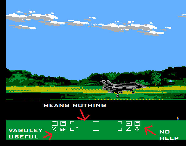 The Combat Flight Simulator (especially the ones with modern day aircraft) has fallen by the wayside in recent years...probably because nobody has a clue how to make one anymore, or the ones that people do make are as hard as a diamond. HAWX really doesn't count since it doesn't have a steep learning curve. In any event, back in the day game developers would experiment with making flight sims on home consoles such as the NES. Many deverlopers would use its primitive technology used to try and create 3D environments and however close you could get to immersion in the early days of video gaming. Most failed or resulted in the difficulty level that gives Nintendo Hard its name, as is the case of Stealth ATF. I mean just look at the gauges they expect you to use when trying to land (by the way, no tutorial is given on landing).