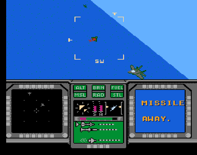 Of course, the game gets harder, and soon you are barrel rolling and firing chaff to avoid missiles as you desperately try to lock onto a maneuvering enemy and toast him, in the hopes that he drops a powerup to repair your damaged radar or engines or whatever that missile hit. Thank god for the molecular-bonded Knight Rider armor, otherwise you'd be cremated when you took that missile to the cockpit. You still have to deal with the effects of damage, though, which are presented in varied way and add to the challenge. The game shines here as each enemy plane in dogfight mode has every viewable angle possible, so that you still feel like your there, if "there" is The Persian Gulf rendered in 48 colors. Perhaps you are really Captain N, only without a narcisstic Simon Belmont as your pilot. Bombing gets harder as you try to match the reticle to your target while evading flak fire and more AA missiles, as well as enemy planes.