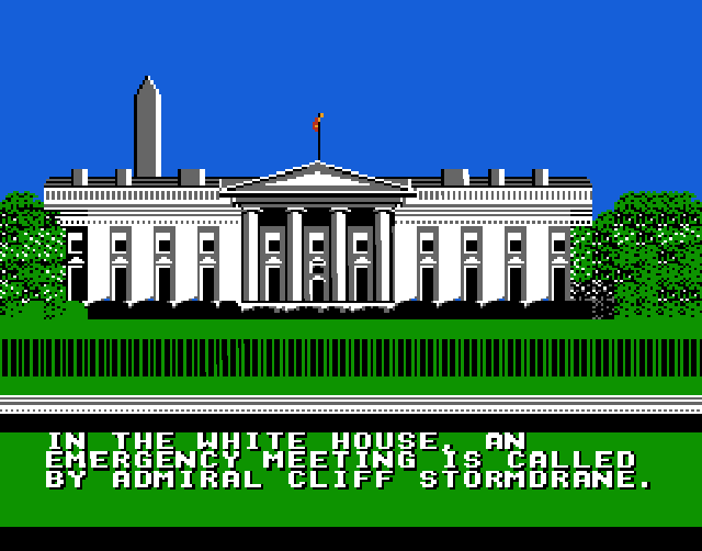 The plot is as follows. Somewhere in the Caribbean, or maybe the Mediterranean, General Don Gwano (whose name means General Mafia Don Honorofic Batshit) has, via a military coup, taken over his country, wherever the hell that is, the Batcave Sea, perhaps? Anyway, he now proposes to go invade other countries near him, cause it's cool and he's evil and that's what evil people do. So anyway, a United States Naval Officer, Admiral Cliff Stormdrane (what a name), calls an emergency meeting about this with the President (let's assume it's George H.W. Bush like it would be at the time) Never mind the fact that the White House seems to have the Washington Monument sticking out of it...there's war to be waged!