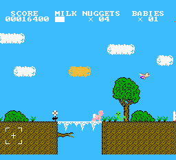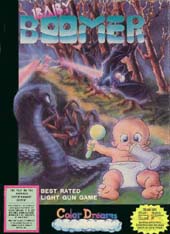 The first title for Color Dreams. Showing their trademark creative-yet-stupid approach, this game lets you use the Zapper Light Gun not as an offensive weapon, but to defend an itty bitty baby as he marches like a lemming towards certain doom and gold nuggets. In fact, if you don' t have a Zapper, you can use the NES controller, or with a friend, you can use both at once if you're like me and are into both giving and receiving the pain.