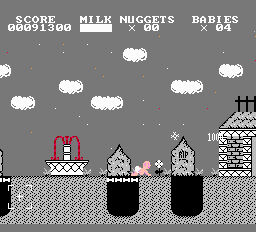 Okay, that's three game cliches in a row... could be worse, though. I hope you REALLY like shooting those damn clouds, because really the only thing Boomer walks on in this level are frozen bridges. And this isn't the only level where you will probably lose a couple Boomer babies trying to figure out what the heck you need to shoot to make a frozen bridge (in the Cemetary, it was usually a cloud but sometimes a gravestone. Here, you might have to thoroughly blast up to three clouds to find the right one, and then it may only build 1/3 of the bridge you need). Watch out for new baddies, like... black frowny face. And raining clouds. This level introduces you to the Gold Milk Bottle, which turns Boomer gold and invincible. It only appears for about a second, then disappears, so shoot it, because the level is even more annoying without it. And stay sharp, you have to shoot a new Gold Milk every few screens or lose it completely. Oh, and check out the lovely Golden Fountain. Hey, wait a minute, that's just a recolor of the Blood Fountain from last level. And the plain water fountain from the first! Who at Color Dreams had the fountain fetish, huh?