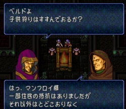 After ridding the nearby villages of pirates (and recruiting the pirates' leader), Leaf reaches the Gate of Kelbeth, entrance to Manster and child-hunting headquarters for the Lopto Church. Leaf learns from August, his tactician, that children are being kidnapped from local villages, taken away to Manster, and being "reborn" as followers of the Dark God. After storming the fort and freeing the children who are currently held hostage there, Leaf is captured by Reidrick. He is taken to Manster Castle, stripped of his weapons, and thrown in a prison cell. This brings us to the best part of the game: the escape from Manster Castle.