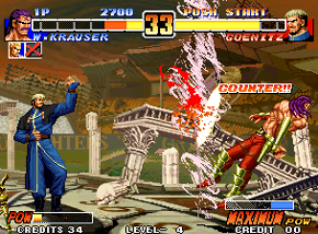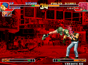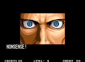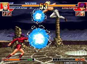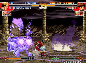 SNK BOSSMAN Rating: VERY HIGH. There's three of them, and you always fight them in the same order. First comes the blazingly fast Chris, who plays one of the most annoying games of keep-away I've ever seen. It's not hard at all to lose to the little prick by time-out. Shermie holds you at bay by hurling lighting bolts and blowing electrified kisses which act like mini-Yonokaze's. Yashiro just grabs and tosses you around until you stop moving. They're only slightly stronger than normal characters, but again, there's