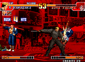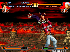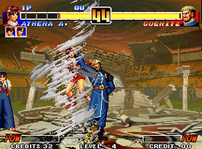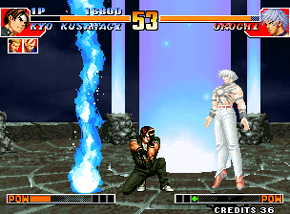 you won't get to." Floored by Chizuru's logic, Iori charges into battle, turning the tide in Kyo's favor. Goenitz shouts for his underlings Vice and Mature to come and give him a hand, but neither of them budge: they've already decided that Iori's growing powers would probably serve the Orochi resurrection better than Goenitz's in the long run.