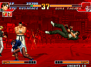 Near the end of the tournament, the call goes out. Iori and Leona go ballistic, while Yashiro, Chris, and Shermie awaken into their Orochi natures. As it turns out, their real reason for entering the tournament was to gather enough energy to awaken Orochi. (I guess it makes some sense. I mean, what with all the fireballs and energy blasts that get thrown around in these fights and all.) They also reveal that they've kidnapped Kyo's girlfriend Yuki -- who is a descendant of Kushinada, the final sealing maiden -- so Orochi can have a little snack when it awakens.