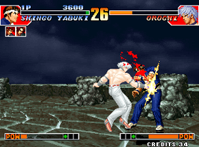 SNK BOSSMAN Rating: Surprisingly low? Orochi has a huge arsenal of effective and deadly attacks, but his AI is about as smart as a goldfish bowl. If you were able to defeat Chris, Shermie, and Yashiro beforehand, Orochi should be a snap. Kinda anticlimactic, huh? Try fighting his "Mizuchi" incarnation in NeoGeo Battle Coliseum, though. Christ. You might as well just walk away from the game when you get up to him.