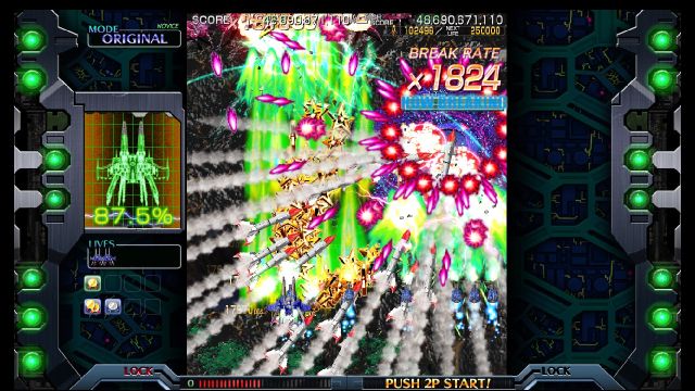 The mechanic of which I speak is, of course, BREAK MODE! Popping your ship into Break Mode offers a satisfying array of lasers, explosions, and skyrocketing point totals that already edges out some of the most hardcore games in the genre in terms of spectacle. Learning when to use Break Mode for huge point multipliers or just to save your own ass is key to playing
