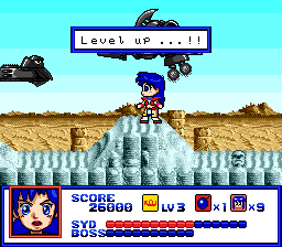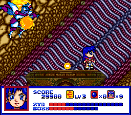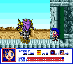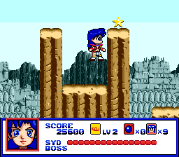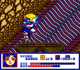 Syd of Valis, anyway. You're at the base of a mountain, working your way to the right as usual. There's also a lot of vertical height to the stage providing you with a lot of very useful power-ups and another 1-up. I don't think I need to tell you by now just how much you need this item, so stick to the top gathering all the hearts and taking pot shots at all the airborne enemies in the stage. Don't try using the kneel trick to speed up these encounters, as you'll drop yourself down to the higher populated areas and suffer unneeded damage. We're going to need every fucking HP we can get for this upcoming boss fight.