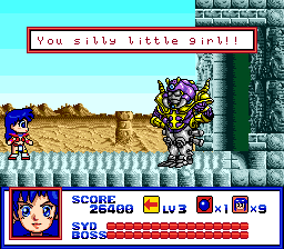 This guy's kind of a walk in the park if you manage to get to him with your invincibility in tact. As soon as he appears he fires a bullshit laser shot at Yuko which is instant damage that I doubt you can even avoid because it just appears when he does and you can't move yet. Par for the fucking course for this game, I guess.