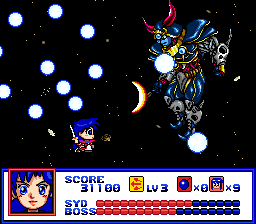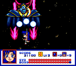His second form is content to just hang out on the right side of the screen and throw shit at Yuko. One of them is a two ring set of fireballs that move slowly to the left. These can be easily avoided by being exactly where I am in the pic and you should be holding down the fire button, with the 3-Way Beam still equipped. The second attack you can see coming a mile away and can dodge from the same position that I'm in. You'll see him charge the attack and then throw a big purple ball of goo at Yuko. Just double-jump over it and continue your assault until the Emperor of Darkness finally falls.