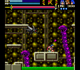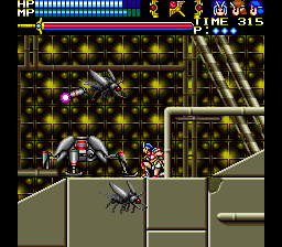 This area is fairly large. You'll notice you can make quite a vertical climb in this stage and find a lot of hidden items, including another 1-up attained by ATTACKING THE AIR! There are only a few enemy types here, but they work well enough. The flying kamikaze bug fuckers zip around and home in on you and like to come in groups of two or three if you don't take your time and deal with them when they first arrive. The purple Tox-o snakes can impede your progress a bit, working well with the kamikaze bugs. Laser traps are enemies that are in the background and can not be destroyed. They float back and forth and fire their laser at the ground, putting a temporary half to your progress while giving other enemies in the area a chance to take a bite out of your hide.