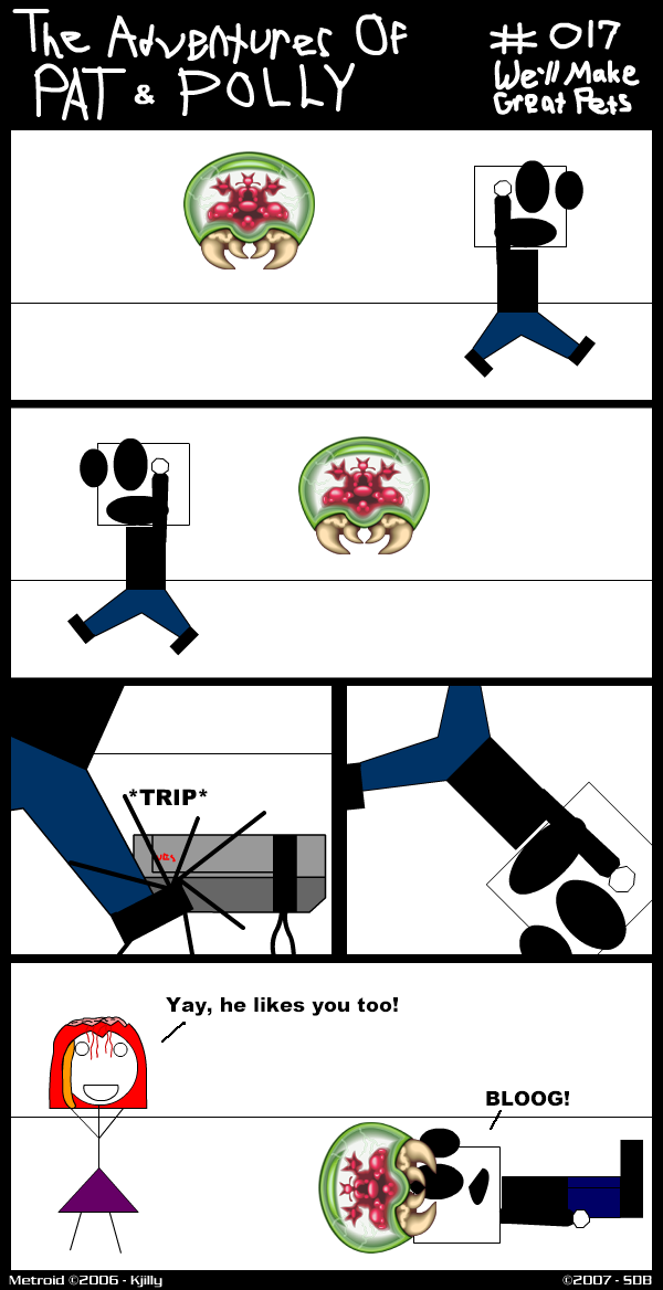 I just wanted to use Kjilly's awesome Metroid drawing in the comic somehow and this seemed the best way to do it. Why's the NES in the middle of the floor for Pat to trip on anyway?