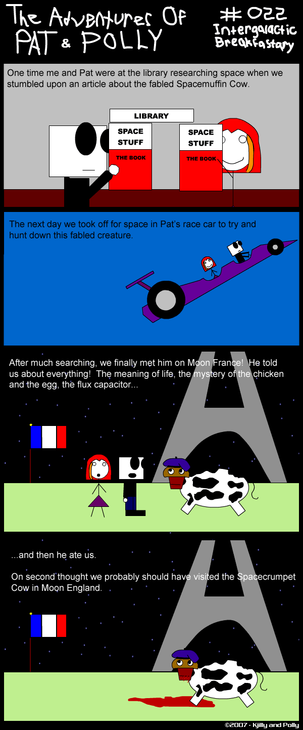 Another odd narraration comic that doesn't make much sense. Spacemuffin Cow no doubt comes from Kjil's own personal trademark, "MOOBASE." I'm really not too sure, but it makes sense. I love that Pat's racecar can fly for no explainable reason. God, I love that this comic doesn't have to make any sense whatsoever and is subject to whatever dumb whim I have.