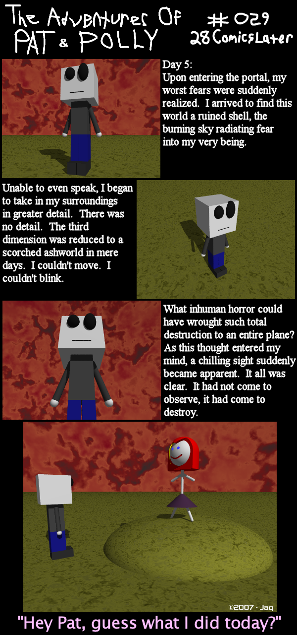 Another one of Jaq's 3D-programmed comics. I remember him wailing to me on IRC for quite a while about having trouble making a 3D Pat. That just seemed to me to be the simplest thing in the world to do in a program like that. But, I guess that's why he programs comics, and I copy and paste the same crappy art comic after comic.
