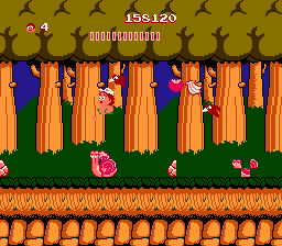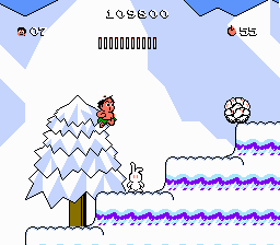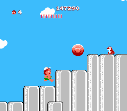 Adventure Island's timer is a bit different. It comes in the form of a stamina gauge. It's constantly counting down and when it hits 0 you lose a life. You can keep the gauge filled with magical fruit that pops up out of nowhere constantly. In doing that, they've also added in rocks, which are obstacles you must avoid touching, because nine times out of ten, they'll always juggle you into a pit or an enemy, and because they drain the stamina gauge substantially. The stamina gauge was an interesting new addition to these kinds of games, because where most platformers made you take your time to do things, you had to be a little quicker about them in