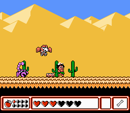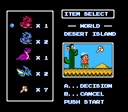 Along with your new dino-buddies, you're also given an inventory. As you collect various items and dino-buddies throughout each stage and complete the stage with it still intact, before you begin the next stage you'll be able to store these special items by pressing B. You can store up to as many as 9 of each item. This can prove incredibly useful, should you find yourself getting your ass handed to you by a particular stage and decide, "Fuck it, I'm flying through this bitch." Or, if you just wanna begin your new life with the hammer, the option can always be there. You can also go into a stage completely unarmed and try finishing it that way, as well. Doing so can actually open up new areas that you've never seen before. How you manage your shit is up to you. The only real downside here is that once you've lost all your lives, unless you find the hidden Hudson Bee, your inventory resets and you lose everything once you continue. BUT THANK GOD YOU CAN ACTUALLY FUCKING CONTINUE, RIGHT?