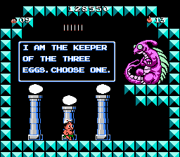 Adventure Island II, it's that if you're serious about actually finishing it, you'd better set aside an entire evening to do so. You're forced to play through all eight of the game's worlds, and with the number of stages you actually have to play in each one varying depending on your actions, it'll eat up a good chunk of time for sure. This might be a good one for the emulator crowd, what with their fancy save states n' all. In playing through this game, even way back in my younger days when I had all the time in the world for videogames, by the end of the sixth island, I was really ready for the whole thing to be over. It simply feels like it sticks around too long, doing way too much of the same thing.