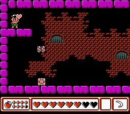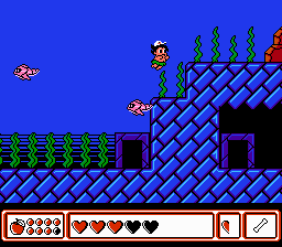 Metroid game. You'll collect many of the same items too, including heart containers, pieces of heart that form another heart, a hammer, a boomerang, and a torch. While Higgins' inventory is fairly large, most of the items you obtain usually only have one use and you'll never use them again. I can't think of more than one instance at all when I needed to use the Spear or Torch. You get both fairly early in the game but each has only one little area where they're useful and then they just sit around in your inventory taking up space the rest of the game.