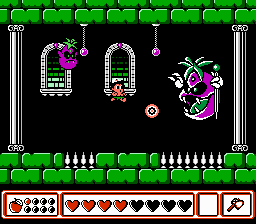 Super Mario Bros. 2. Master Higgins and his enemies all feature about the same amount of detail and animation you'd get in either of the two Mario games out at the time, except Master Higgins has a little "I have to peepee" dance he does anytime he's not moving. For the longest time I thought this game was just one big journey to find a damn bathroom and the stamina gauge draining was Higgins' bladder control. Anyway, the sprites are passable enough to tell what they are and what they're doing. Serviceable, but nothing to get excited about.