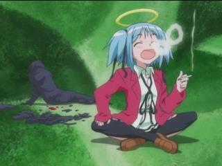 *), within about three or four minutes you'll have a pretty damn good idea of what you've gotten yourself into. In just the first episode of the show you'll get bloody decapitations and disembowelments followed by naughty sexual teasing, which is again followed by more disembowelment and some fun dancing! And that's just the god damned intro and opening theme song animation. Each small story the show tells is fairly straightforward and will ultimately only lead to more Sakura-abuse and humiliation. Whether he's getting beaten to a bloody pulp or chased by other angels that want him dead at school or a theater, being embarrassed by Dokuro at the library, or poisoned and completely forgotten on a class camping trip, Sakura's plight always remains sadistically entertaining. Dokuro-chan is almost the only character in the show to go completely unscathed throughout the entire run, save one "explosive" experience. Everyone is subject to all the random violence, humiliation, sexual lewdness, and explosive diarrhea the show can dish out. Yes, you read that right, and yes, it is funny. In the end, that's probably what makes the show's ridiculously over the top antics a bit more tolerable for most.