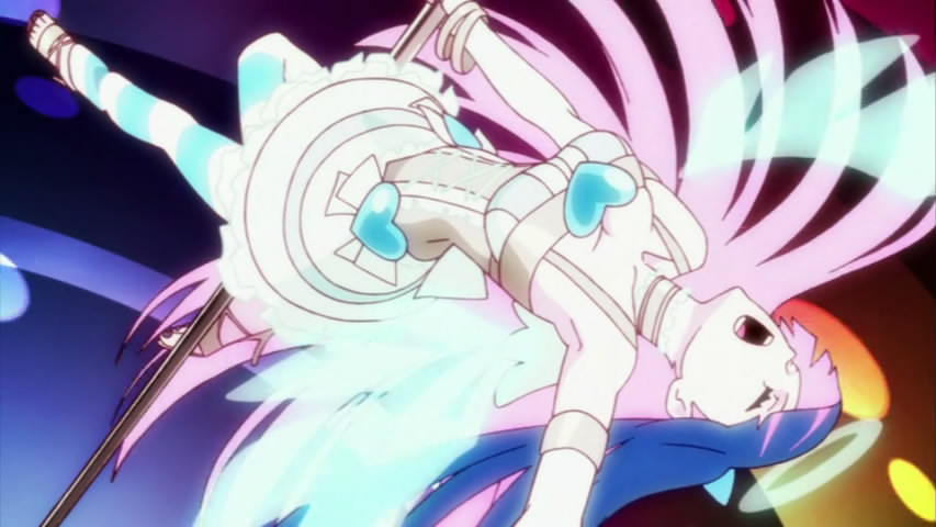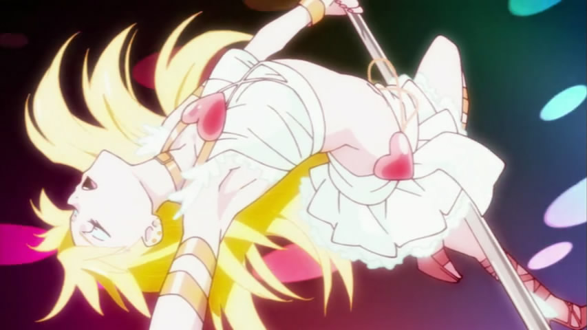 The character designs are slick, colorful, and so angular they might gash into your eyeballs. A breath of fresh air from all the saucer-eyed pudge-faces of moe-dom we get these days. Though they purposefully lack the detail seen in a lot of GAINAX productions, they all stand out, are easily recognizable, and just the still images sport a personality and attitude all their own that might just whoop your ass if you look at them the wrong way. At certain points throughout the show, though not every episode thankfully, the girls enter an elaborate, almost magical girl-esque transformation sequence, complete with pole dancing and shedding of undergarments. During these scenes, the angular look is dropped for a more jarring and realistic depiction of our heroines with