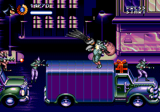 Contra. They both have the same shitty Batarang attacks that work on an intensely stupid charge meter. Yeah, unless you find one of those rare power-ups, you actually can't use your Batarangs to their full potential until the BAT GAUGE FUCK YES charges up, which takes about a second. In the heat of combat, this is just unacceptable and the fact that your unpowered Batarangs are next to fuckuseless really doesn't help. Don't die when you do find one of those fuckrare power-ups either, or you're completely fucked. The only decent move in your Bat arsenal is the jump kick. When it connects, it hits up to about four times which is almost usually enough to get rid of normal enemies. Get used to just tapping the fuck out of the B button is all I can say.