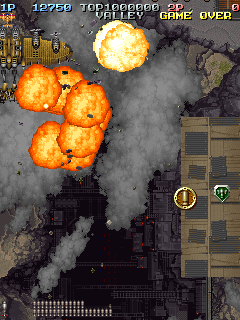 Shooting a few more enemies gives you a small shot icon, which works like the bomb icons in that you simply need to collect more to power up your forward gun. Eventually, killing enemies will get you a medal. It isn't much of a medal, only worth 100 points, but medals are the key to score in this game. Every time you grab all the medals on screen, the game takes the last medal collected and ups the value of the next one up to 10,000 points. Obviously, grabbing a bunch of 10K medals will pad your score nicely. However, if you let the last medal on screen fall down, the values are reset to 100 points. This medal system would be carried over to Raizing's future games like Armed Police Batrider and Battle Bakraid, and to an extent Cave's Ibara which was made by the same people.