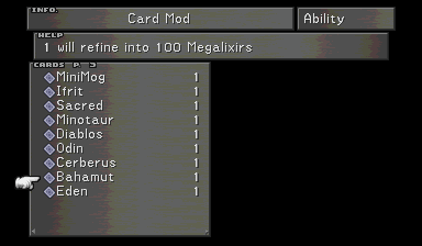 Lots of free items. You don't even need to spend hours playing Triple Triad to reap some pretty incredible benefits from Card Mod. Just look at the screenshot. The Bahamut Card can be refined into 100 Megalixers, and you don't have to play a single card game to acquire it.