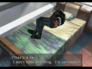 DAY THREE, HOUR SEVEN: Uematsu steals one of Nomura's pens and scribbles gibberish in Roman characters all over the walls. He realizes that a small part of it, reading "CESONIV SOCEW CESUL SOHTFI," spells out words in Latin when he looks at it backwards. Astonished by this coincidence (and the fact that he suddenly knows Latin), Uematsu has found his inspiration for