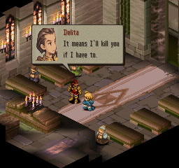 Tactics Ogre, Final Fantasy Tactics chooses for him. After the climax of Act One, the player follows Ramza down the "lawful" route, while the doppelganger Delita chooses "chaotic." You might say this spares the player some time at the expense of freedom: while most games with a pivotal yes/no dilemma require at least two playthroughs to explore the alternate plots,