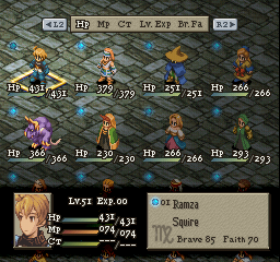 Tactics to the end. This is a little deceptive, as Ramza is by no means a lousy character. Unlike most Squires, he can equip heavy weapons and armor, and gets some killer skills through his Guts ability. A unit that can instantly increase his own attack power, speed, Brave, and Faith at no cost whatsoever is a unit to be taken seriously.