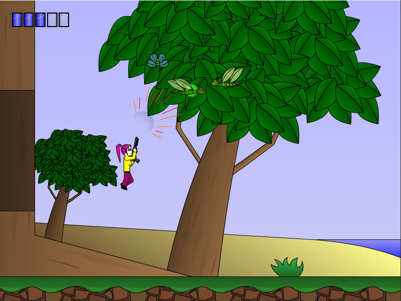 Inthri series, with a bit more background detail and some really nice looking environmental effects. Since this is a platformer, Carina as well as her enemies needed to have a bit more range in movement, and the visuals provide just the right amount of animations for running, attacking, and jumping around, and added points for the fact that sprites aren't mirrored when facing opposite directions. Also, if you watch closely, you'll even catch some interesting details in character movement, such as during the first fight with Mizar, she'll be working around with the controls in her robot as she attacks you. In what seems to be the norm for i-produced games, the bosses steal the show here again, and why shouldn't they? They come in all shapes and sizes and sport so much character that they can't help but draw attention to themselves due to their size as well as a few sporting quite a few really nice looking animated effects. Though it may seem simple and unimpressive to some,