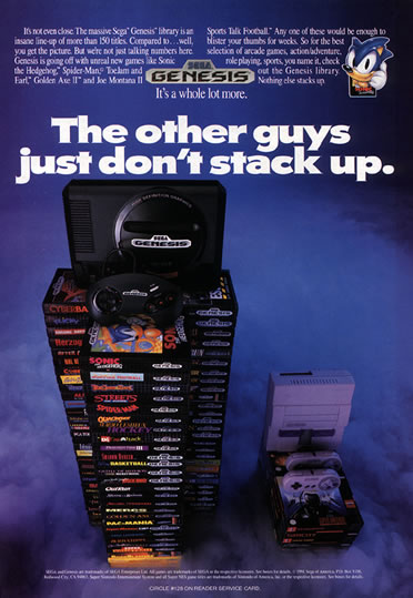 This one is an ad from when the SNES had just launched, and Sega was firing off it's first salvo in the hype wars. One supposes that Nintendo never felt they had the need to fight this dirty. To this day, none of their games involve these sorts of smear tactics of self-aggrandizing posturing and while one can appreciate Nintendo's confident posture, it does make them predictable and less fun from a marketing point of view.