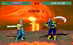 The cast of characters is a random bunch of fighters from different times, and for some reason they're trying to kill each other. (Time killers. Hehe.) The gimmick here is that each fighter has a weapon that can be used to sever the arms/legs/head of their opponent. Where it fails is when the CPU opens a battle by sending your head spinning into the sunset, ending the battle instantly.