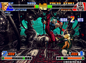 Storyline: Upon his defeat at the hands of Kyo and his teammates in the first tournament, Rugal activated the Black Noah's self destruct mechanism and was thought to have perished, but manages to survive using the mysterious power that Goenitz gave him. After relocating to one of his secret underground bases, resting up, and bionically replacing a few destroyed body parts, Rugal is ready to enact some good old German
