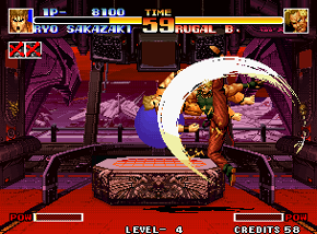 SNK BOSSMAN rating: EXTREMELY HIGH. Rugal is a jerk. He's the first definitive SNK BOSSMAN and still probably king of the hill, give or take an Igniz. His first form is tough enough: not only do all of his attacks have ridiculous priority, but he also suffers from Street Fighter II AI Syndrome, which basically means that the computer is allowed to do whatever the hell it wants. If the computer thinks you should be thrown, you WILL be thrown, even if you happen to be half a screen away at the time. But this is