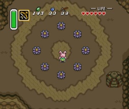 I wasn't even that impressed by the dark world, which was (is?) generally considered to be one of the game's high points. As a plot twist, it was executed rather well; being sent there certainly took all of us by surprise. And some parts of it actually look creepy - particularly the Lost Woods (though the music does a great job to ruin the mood here). A lot of it doesn't. The pink clouds on Death Mountain, the blue and red trees, the yellow grass, and Link's pink bunny alter ego just look out of place. The dark world is just too bright and colorful to really be dark. Later installments took this concept of a dark world and refined it, which yielded some great results. In Ocarina of Time, for example, the first thing you see when you leave the Temple of Time is the marketplace overrun with zombies. There's no lame Star Wars-themed music to ruin the moment (no music at all, actually), no genetically mutated chickens running around to get in your way, nothing to detract from the experience. It's dark and desolate, and sufficiently creepy to get the point across without overdoing it by changing the entire world map. Majora's Mask also had some really nice touches; the best are the villagers' reactions to the moon near the end of the three-day sequence.