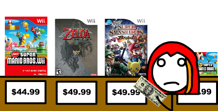 Super Smash Bros. Brawl weighing in at a chunky $50. One of them is fucking four years old, another already has a sequel on the market, and the last...well fuck you, I just don't think it's worth $50. HEY, NINTENDO! YOU'D BE A HELL OF A LOT MORE LIKELY TO SELL ME ON THE SEQUEL IF I COULD GET THE FIRST ONE AT A DECENT DISCOUNT! THERE'S A VERY DISTINCT CHANCE OF ME (OR ANYBODY ELSE) PLAYING IT AND GOING, "HEY, I SURE HAD FUN WITH THAT