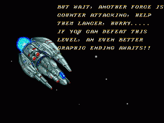 The first two stages of this game though, are brilliant, which is quite a good thing since most people never see anything else. The first stage starts with an awesome take off sequence, then after a short space skirmish you fly through an asteroid field, before speeding up and taking out a miniboss. You slow down, then have your choice of going above or below a large asteroid. The top leads to an almost earth-looking stage with blue sky and mountains, while going below forces you to dodge falling rocks. Both of these lead to a large cave, before you finally fight the stage boss. And that's just stage 1!