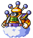 Cloud Man is an odd one. He's an air-based boss, but unlike most of them, his weapon isn't actually wind-based. Instead, he holds an electric attack for a weapon, the Thunder Bolt. When you use it, it's just a little spark that splits into two when it hits something. Cloud Man is also a joke when you use his weakness on him; one hit of the Danger Wrap, and some good timing, and you'll win without taking a hit.
