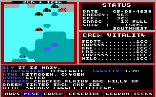 The sequel removed this time limit, realizing the true free-form adventure design. So how did the second game convince you to get started with the story? By mugging you. You have to grovel to a blob of slime (the Spemin) and give up some (or half) of your fuel, or they blow your ship into non-returnable fragments. So you want revenge, you want the same technology and kick their asses (do blobs have asses? Doesn't matter), which was how the story of the game begins. This game then expands into a rather deep plot. Plus, your first, second, and all meetings with the Spemin are completely random. No scripted events until near the end. One last note about the 'ending', you can change how it ends, and showing mercy actually gets you the better ending. One could argue that the second game, since it doesn't change the interface or adds any new crew positions, is not a full sequel to the first game, but it's a hollow argument. In Starflight 2, you had to land on planets and trade with the aliens living there, unlike in the first game where could only trade at the home base.