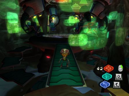 This game does kind of have two major problems. The first is that this game tasks you with finding lots of crap. Imaginary figments, emotional baggage, arrowheads that are used as money, memory vaults, and brains just to name a few items. It can get kind of annoying and tedious to run around looking for stuff. Hell, I must have almost worn out my 'F' key looking for the deep arrowheads. At least in Psychonauts, you can start using the quarter life extensions as soon as you get them. Hear that Zelda: Twilight Princess and your freaking 5 heart pieces to find for one heart? The second problem is that it has a really weird difficulty curve. The game starts out nice and easy, and then around the Godzilla level, the difficulty jumps up to around 'beat you upside the head' level. The game also randomly jumps between the easy and hard setting very quickly, sometimes right in the middle of a stage or even a boss fight, when one segment is clearly much harder than the others. Some parts aren't even that hard, they're just really annoying, like the first part of the meat circus level.
