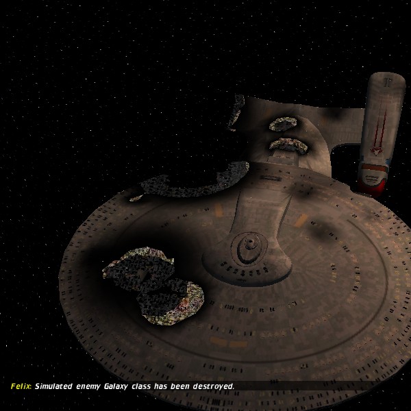 And speaking of destruction, that's one area of the game that can factor in heavily during gameplay: Your ships' models are destructible and can deform as they take damage. You can literally blow a hole through a ship, and damage or instantly destroy any subsystems in those areas. Naturally, you can turn this feature on or off in the game's settings. But it can have a huge effect on the tide of battle. And it's just fucking cool. You can watch a ship get chewed away by your phasers and have holes blown through it by photon torpedoes. Or you can cringe as you collide with another vessel during combat, which will gouge out huge portions of the hull. And after a particularly grueling battle, not only will you feel like you just got by with the skin of your teeth, your ship will usually look much the same way.