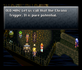 Chrono Trigger's most famous and enigmatic lines. After the player acquires the Epoch and the game "opens up," speaking to Gaspar at The End of Time will cause the old man to drop several clues about the places and people linked to optional quests. One of the last things he says in the original version translates to something like: