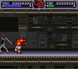 Moving on to the city slums, this one starts off not unlike the first level of the Genesis platformer El Viento with guys on motorcycles endlessly assaulting you, but nowhere near as hectic (that game at least had decent controls). They die in one hit, so it's relatively simple to get past them and the Contra III stage 1 vertically shooting flames that come out of the street. Next you make your way up a fire escape while cyborg bodybuilders bust out of doors and roll into balls at you while generally being impossible to dodge. At the top you fight two clawed guys with paperbags over their heads who assault you from either side. Just keep alternating left and right with your thrust attack and they'll go down quickly. So far the actual stages in of the game don't present that much of a problem, and health items are liberally dispersed throughout. After going across some rooftops and fighting generic grunts you take an elevator to the stage's end.