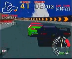 Your guy must have gotten tired of running, because you take on this boss in a racecar. You drive around a track based around a coastal town with mountain ridges, so I guess we're in Maine now? The driving physics are pretty funky. You drift all over the place and plowing into walls only causes a slight bump and a decrease in speed. Pretty soon you'll pass the black car on the side of the road, and after a little while he'll come after you. This motherfucker is