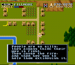 Perhaps this little angel, if there is ever an ActRaiser 3, will be its rebellious villain, out to dispose of the silly diety helping out the silly humans. With fire, just for the kicks. I probably shouldn't talk, though; I did comically tried to respond to the fire with the Sun miracle, but the game wouldn't let me. I guess you have to be a good savior.