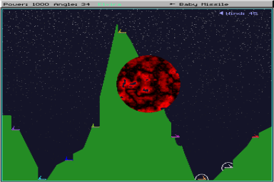 The greatest competitive gaming experiences I've ever had on a PC have come from these 633 KB of pure joy. It's about as graphically flashy as an Atari 5200 game, and its soundtrack consists of whatever sound your computer fan makes interposed with the occasional "BUZZ" "BLEEP" and "BOOOOOM." Neverthless, I cannot tell you how many afternoons with my friends Jef and Scott and how many evenings with my cousin Matthew were whittled away arguing over the ethics of buying nothing but Death's Heads and firing them straight into the air at full power EVERY TIME IT WAS YOUR GODDAMN TURN, forming machiavellian alliances against whichever of the seven or eight computer-controlled tanks we suspected of being Cyborgs, and cursining at the screen whenever a Funky Bomb or Heavy Sandhog attack went awry.