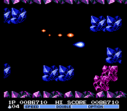 Gradius II on the Famicom pretty much plays it straight and remains almost 100% faithful to the arcade original. Hell, the arcade was good enough, so why mess with what ain't broken? There's really not much missing or changed here and it stands as one of Konami's most faithful Famicom/NES ports. Unfortunately though, it does seem to crumble a bit under the weight of its gigantic arcade cousin's large cabinet-shaped ass.