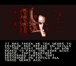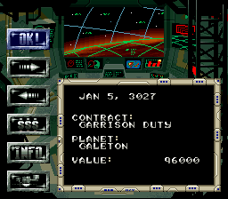 Mechwarrior for the SNES retells the story of the first Mechwarrior PC game, with a few noticeable differences. While you are seeking to avenge your family's death, you're not doing it by trying to hire up a team of mercenaries to fight alongside you, No this is strictly a solo gig. Anyway the game starts you out with a crappy light mech and a few low-risk jobs you can take using said mech. The idea of course is that you use the money from your contracts to get better weapons and better mechs, which get a chance for you to get more dangerous missions, eventually getting more info through rumors at the bar and working your way up to a confrontation agains the "Dark Wing Lance" (yes, they are seriously called that).